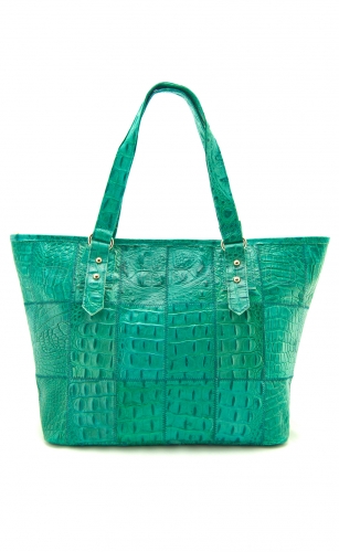 Модная в этом сезоне – женская сумка из натуральной кожи под рептилию насыщенного бирюзового цвета, состоящая из прямоугольных кусочков. Сумочка держит форму, имеет твердое дно и в комплекте к ней идет съемный регулируемый ремешок шириной 20 мм. Снаружи с внешней стороны имеется кармашек на железной молнии. Само изделие тоже застегивается на молнию и имеет золотую фурнитуру.