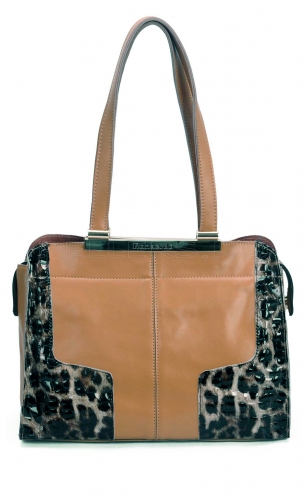 Оригинальная модель и стильные лаковые леопардовые вставки, все это можно отнести именно к этой женской сумочке из натуральной кожи. Благодаря оптимальной длине ручки, ее можно носить как на плече, так и просто за ручку. Вся фурнитура сумки декорирована под золото, а центральная молния выполнена из пластика.