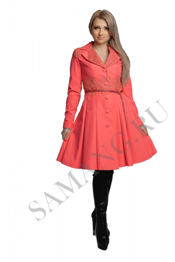 Плащ с декором по талии, плечам, воротнике из красивого кружева. Застегивается на пуговицы обтянутые плащевой тканью. Карманы застегиваются на молнию. На рукавах по 5 пуговиц, обтянутых плащевой тканью